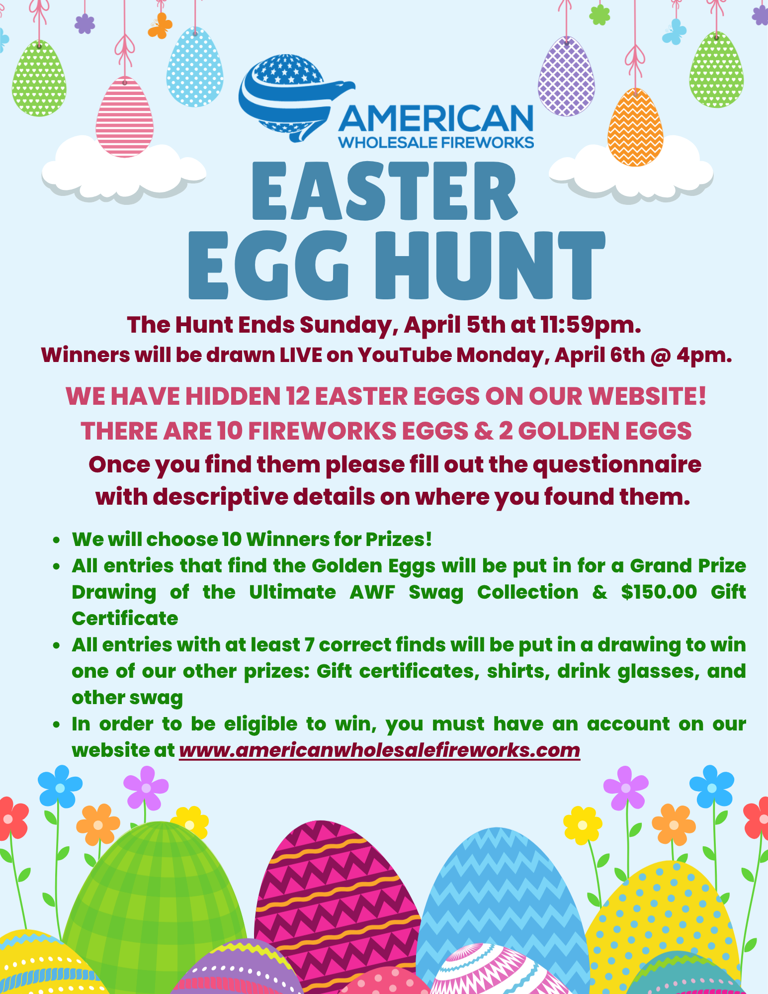 Winners will be drawn LIVE on YouTube Monday, April 6th at 4 PM - TUNE IN HERE: YOUTUBE LIVE - EASTER EGG HUNT DRAWING