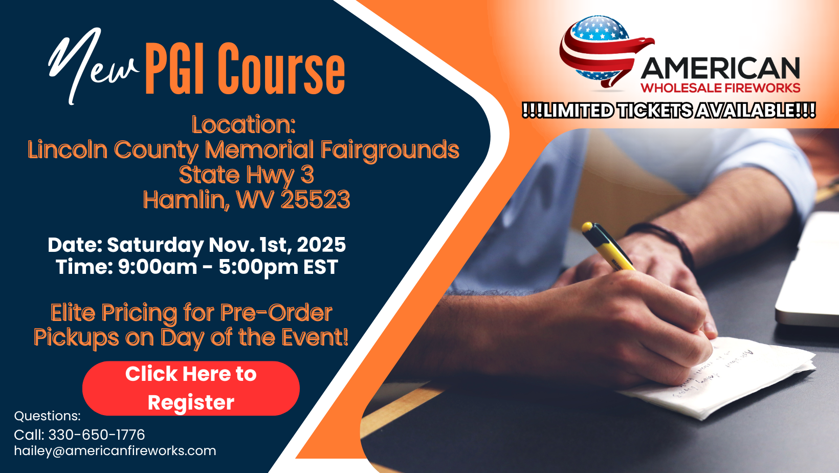 American Wholesale Fireworks is proud to announce we are sponsoring a PGI Display Operators Course Continuing Education Courses on October, 25th.